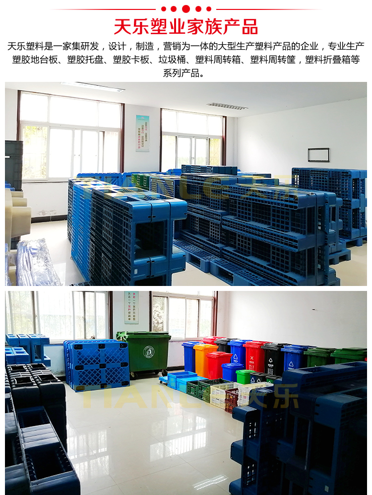山東天樂塑料科技有限公司,主要生產塑料托盤,塑料周轉筐,塑料垃圾桶,銷售木包裝箱木托盤,膠合板托盤,產品使用于汽車、食品、醫藥、造紙、印刷、電子、電器、化工、紡織、服裝、倉儲物流、環衛等行業。產品多規格全價格實惠,大廠家售后保障體系完善。產品品種,以載重量分類,包括:一次 使用的特輕型、輕型、標準型、貨架加重型等適用范圍:食品醫藥化工紡織汽配廠等行業倉儲物流運輸用