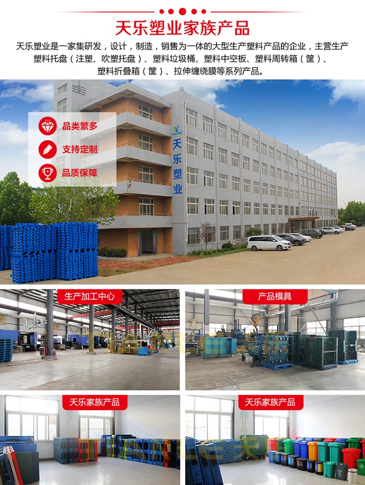 天樂塑業是一家集研發,設計,生產,銷售為一體的大型塑料制品的企業,公司擁有大型注塑吹塑設備、托盤焊接設備十多臺,截止目前產品模具多達七八十種,產品規格品類繁多,公司擁有經驗豐富的設計研發人才、設備維保技師,可提供產品顏色、重量、logo等定制服務、代加工服務。公司主營生產:塑料托盤、塑料垃圾桶、塑料周轉箱(筐)、塑料折疊箱、PP中空板、拉伸纏繞膜等系列產品。